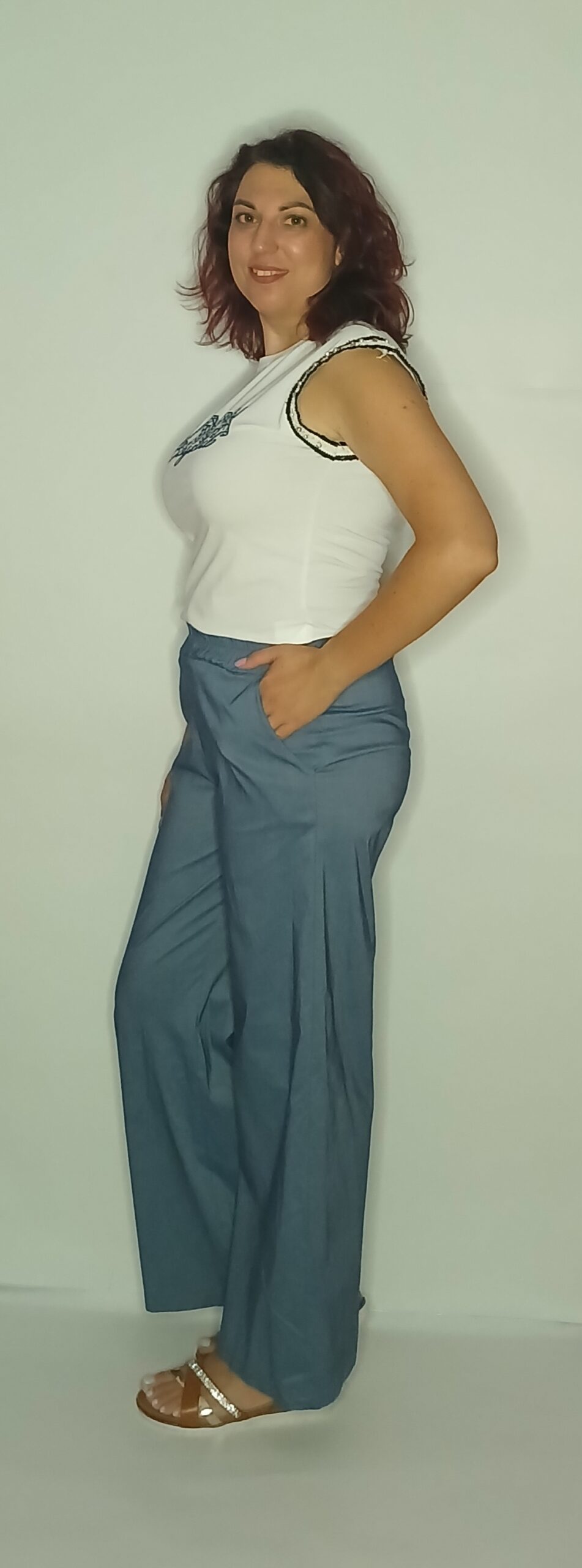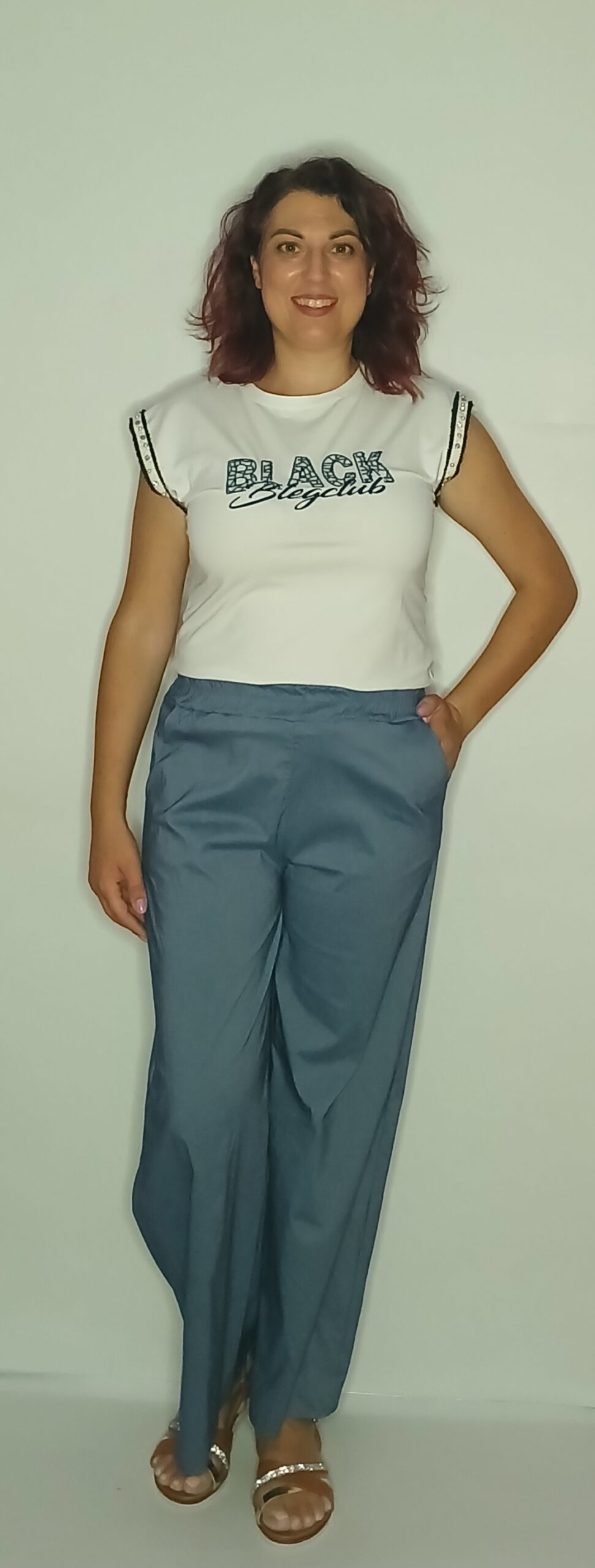 T-SHIRT ΛΕΥΚΟ ΜΕ ΚΕΝΤΗΜΕΝΑ ΓΡΑΜΜΑΤΑ ΣΤΟ ΣΤΗΘΟΣ ΚΑΙ ΣΤΡΑΣ ΚΑΙ ΞΕΦΤΙΑ ΣΤΑ ΜΑΝΙΚΙΑ. ΕΙΝΑΙ 95% BAMBAKI ΚΑΙ 5% LYCRA. ΚΑΛΥΠΤΕΙ ΜΕΧΡΙ 110cm ΣΤΗΘΟΣ, 95cm ΜΕΣΗ ΚΑΙ 110cm ΠΕΡΙΦΕΡΕΙΑ.